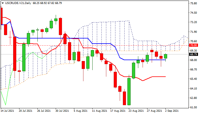 Bulls are on course for renewed attack at daily cloud base ($69.25) which capped the recent strong rally, with narrowing cloud which is going to twist next week, expected to be magnetic.