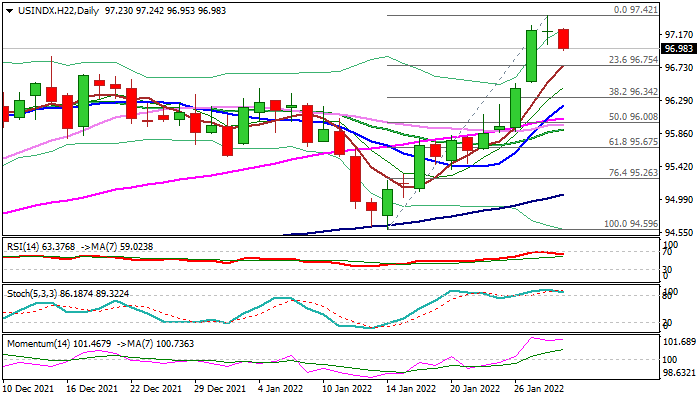 Caution on potential loss of 96.30 zone supports that would risk deeper pullback towards 96.00/95.67 (Fibo 50% and 61.8% retracement respectively).