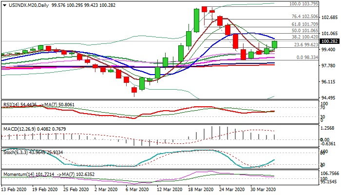 Fresh advance improved technical picture on daily chart as the price eventually broke above initial Fibo barrier at 99.62 (23.6% of 103.79/98.33) after three unsuccessful attempts and heading towards key Fibo level at 100.42 (38.2% retracement) reinforced by falling 10DMA (100.48).