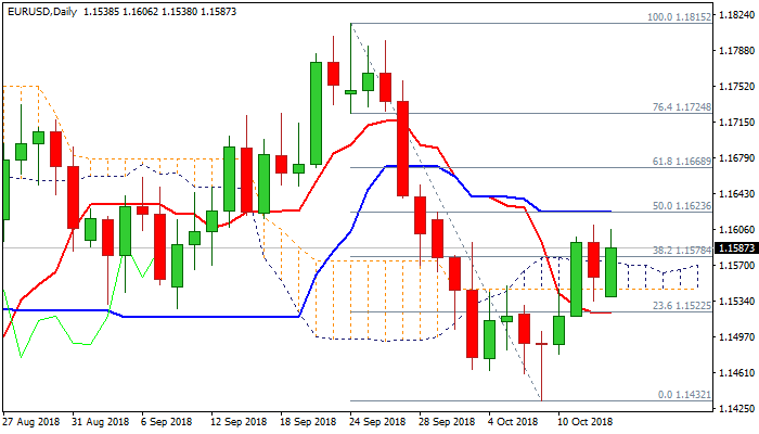 Fresh risk aversion helped single currency to fully reverse Friday’s losses and generate bullish signal on return above daily cloud, with advance being additionally boosted by weaker than expected US retail sales in September, which deflated the dollar.