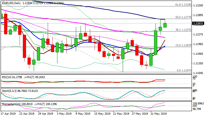 The Euro remains at the front foot in early Wednesday’s trading and attempts again towards key barriers provided by daily cloud top; 100SMA  and 50% retracement of 1.1448/1.1107 fall (1.1277/79) where Tuesday’s attack was strongly rejected.