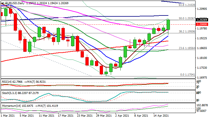 Fresh bulls cracked 50% retracement of 1.2349/1.1704 (early Jan / late Mar downtrend) and eye 100DMA (1.2052) which guards next key obstacles at 1.2092/1.2102 (daily cloud top / Fibo 61.8% of 1.2349/1.1704).
