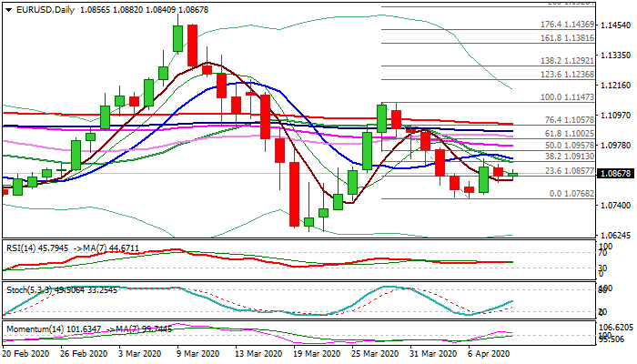 Falling converged 10/20DMA’s offer solid resistances at 1.0910/24 zone (also Fibo 38.2% of 1.1147/1.0768) with firm break here to open way for stronger recovery towards 1.0975 (55DMA) and psychological 1.10 barrier (also Fibo 61.8% of 1.1147/1.0768).