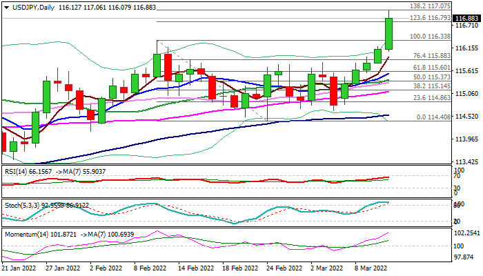 Fresh bullish acceleration broke above former 2022 high (116.35, posted on Jan 4) and probed above 117 level, hitting the highest levels since Jan 2017.