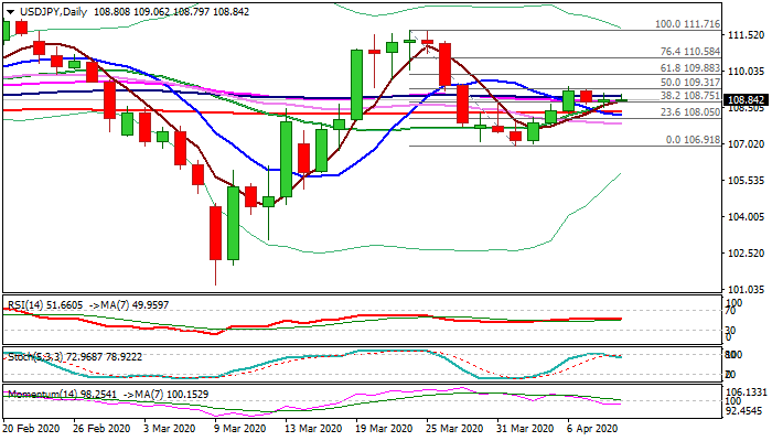 The pair is moving within the narrow range for the second day, with action being capped by 100DMA (108.96) and falling thin daily cloud.
