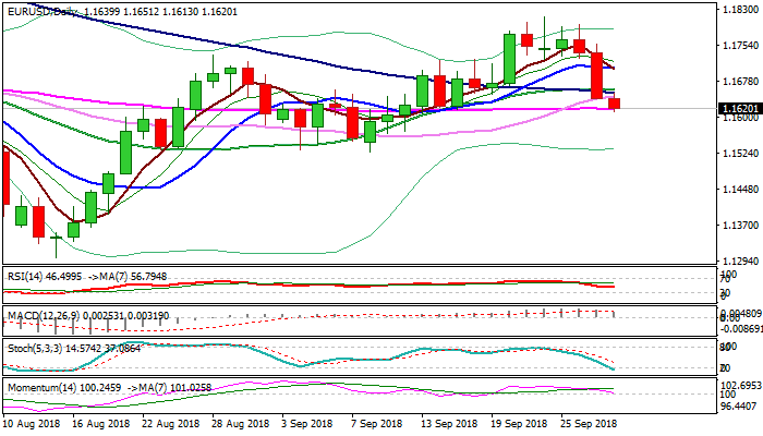 The Euro extended pullback from 1.1815 high through pivots at 1.1655/36 (rising 30SMA / Fibo 61.8% of 1.1526/1.1815 upleg) and cracked sideways-moving 55SMA (1.1617) which marks next key support.