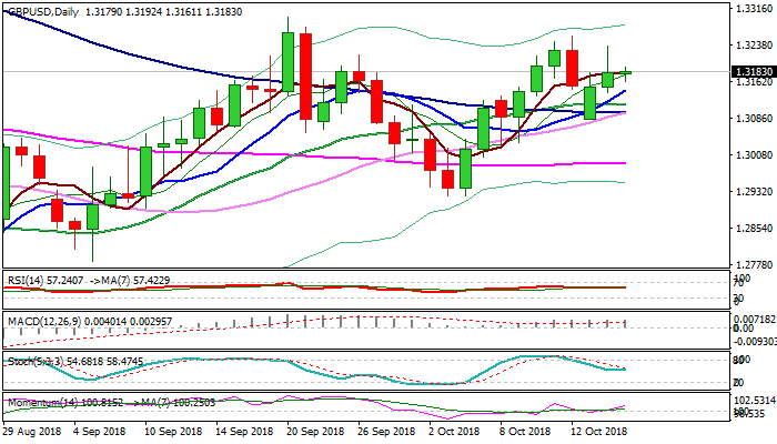 Daily techs are bullishly aligned (strengthening momentum and bull-crosses of MA’s), but sustained break above 1.32 barrier (1.3191 is Fibo 61.8% of 1.3257/1.3083) is required to confirm bullish scenario for eventual attack at 1.3257 target (12 Oct high).