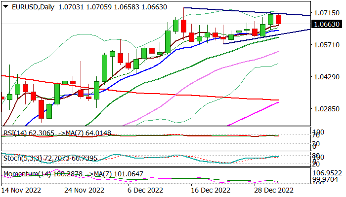 The action faces headwinds from falling weekly Ichimoku cloud and lacking momentum to break through Dec 15 peak (1.0736).