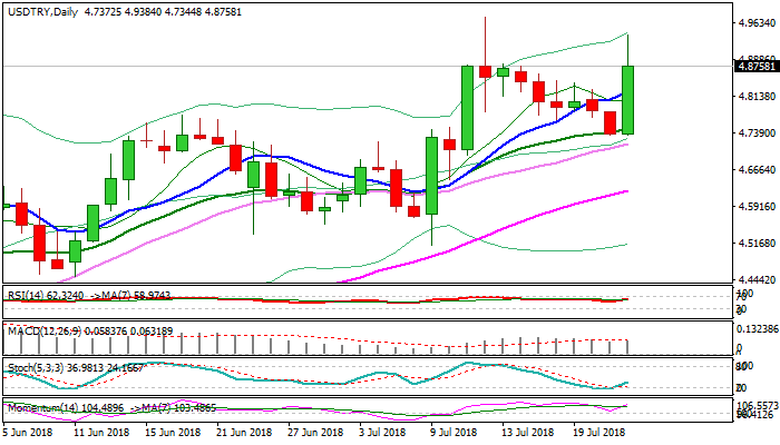 The USDTRY pair spiked to 4.9384, keeping so far 12 July 4.9736 historical high and psychological 5.00 barrier intact.