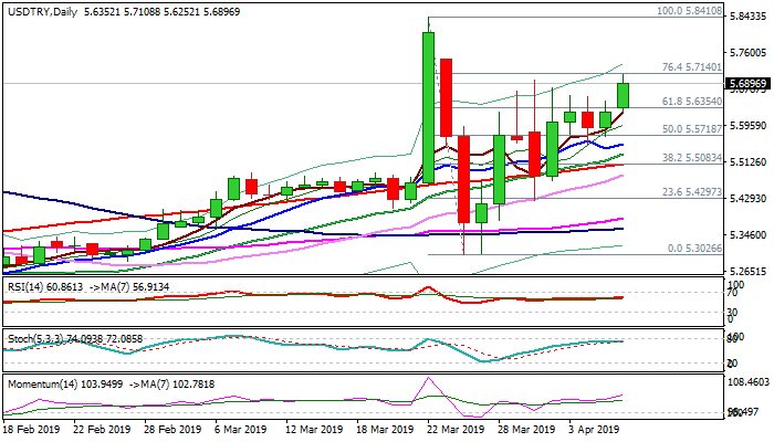 The USDTRY rallied on Monday too new two-week high, signaling eventual break above strong Fibo barrier at 5.6354 (61.8% of 5.8410/5.3026), below which the action was congested for over one week, unable to clearly break higher, despite strong upticks.