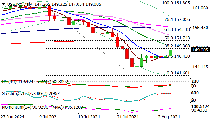 USDJPY jumped to two-week high on Thursday after better than expected US economic data (retail sales / jobless claims) reduced growth concerns and shifted expectations from 50 basis points Fed rate cut in September to initial 25 basis points plan.