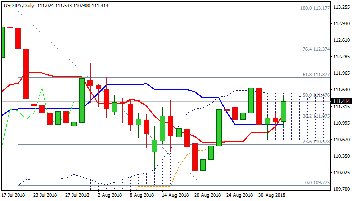 The pair rallied and holding near daily high at 111.53, maintaining strong pressure on daily cloud top (111.57) after receiving fresh boost from upbeat US data.