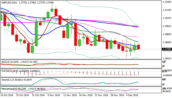 Weakening momentum on daily chart and MA’s in negative setup maintain negative tone for renewed attack at 1.2661 (2018 low) cracked on Tuesday’s spike to 1.2658.