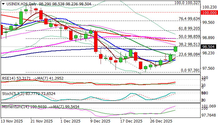 Technical picture on daily chart has improved on break above recent consolidation range top (98.40, reinforced by 100DMA) and attack at pivotal Fibo barrier at 98.41 (38.2% of 100.32/97.39 bear-leg), where bulls faced headwinds.