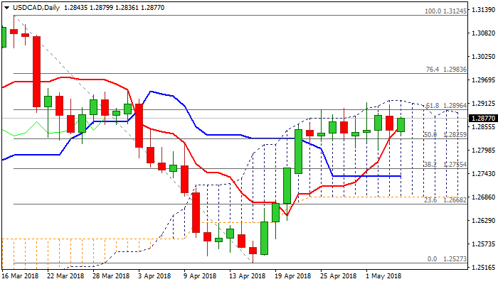 Recovery leg from 1.2527 (17 Apr low) shows strong signs of stall at pivotal barriers at 1.2896 (Fibo 61.8% of 1.3124/1.2527 bear-leg) and 1.2918 (daily cloud top), but so far lacking reversal signals as downside attempts were limited and daily MA’s remain in full bullish setup, helped by growing bullish momentum.