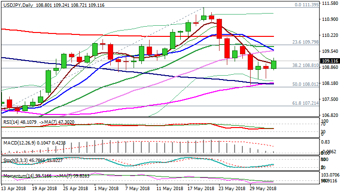 The pair accelerated higher in early Friday’s trading, following triple downside rejection which left long-tailed daily candle of past three days, signaling that pullback from 111.39 (21 May high) runs out of steam.