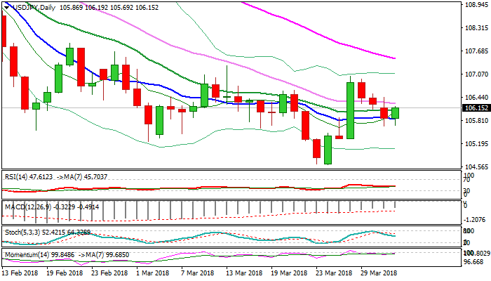 The pair regains traction and returns above 106 handle in early European trading on Tuesday, after being under pressure in Asia, for extension of bear-leg of past three days from 107.01.