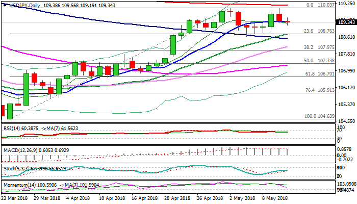 The pair remains biased higher and looks for renewed attack at key barriers at 110.00 and 200SMA (110.15) after bulls were repeatedly rejected at psychological 110 barrier on Thursday and subsequent pullback contained by 10SMA (109.40) which marks key near-term support.