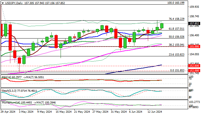 Technical picture on daily chart is bullish, although with warning of increased headwinds expected at 158.22 Fibo barrier, as stochastic continues to fluctuate around the borderline of overbought territory.