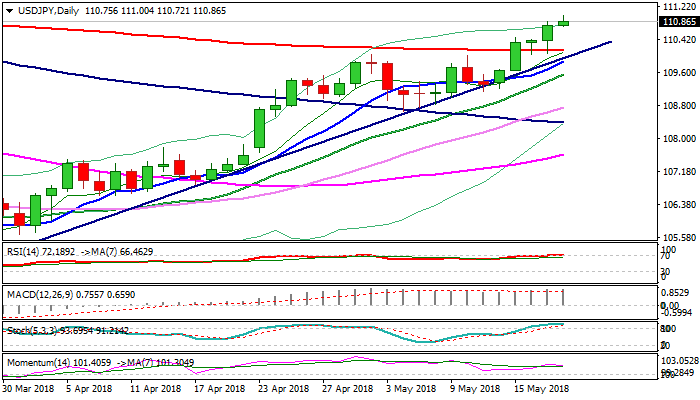 The pair maintains firm tone and hit new four month high in early Friday’s trading as extension of week-long bull-leg from 109.20, probed above strong Fibo barrier at 110.87 and cracked psychological 111 resistance.