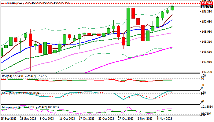 USDJPY keeps firm bullish tone and extends gains, after 1.4% advance last week and hit new 2023 high on Monday.