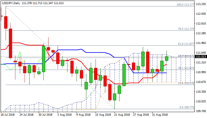 Extended consolidation under cloud top should be contained above rising daily Tenkan-sen (111.25) to keep bullish bias intact.