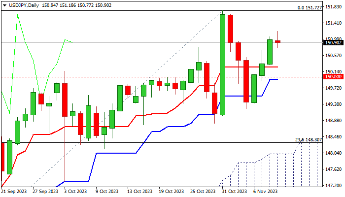 Fresh advance from correction low of Nov 3 (149.19) after bears were trapped under daily Kijun-sen, extends into fourth straight day and probed above 151 mark, threatening retest of Oct 31 peak (151.72 and a multi-decade highs at 151.94 (posted on 21 Oct 2022).