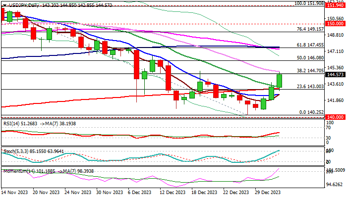 Bulls broke and extended well above 200DMA (143.13) and cracked pivotal Fibo barrier at 144.70 (38.2% of 151.90/140.25 downtrend) but may face headwinds as stochastic is overbought.