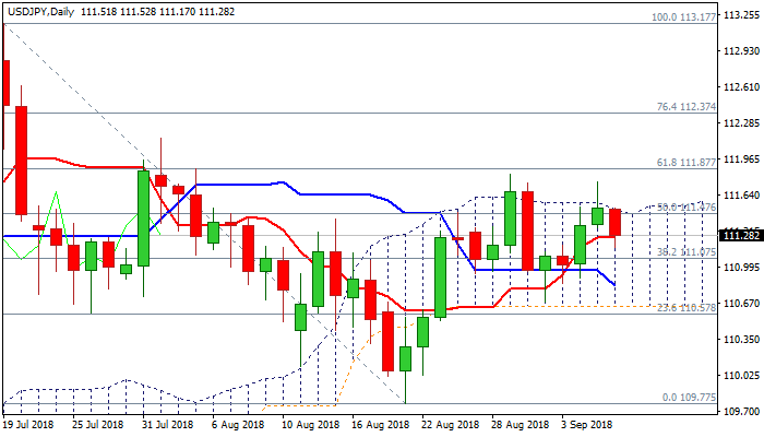 Wednesday’s failure to close above cloud, following spike to 111.75 and repeated rejection at cloud top (111.51) today, suggests the pair may extend sideways mode under cloud top, before establishing in fresh direction, with focus on US jobs data on Friday, which could be a catalyst.