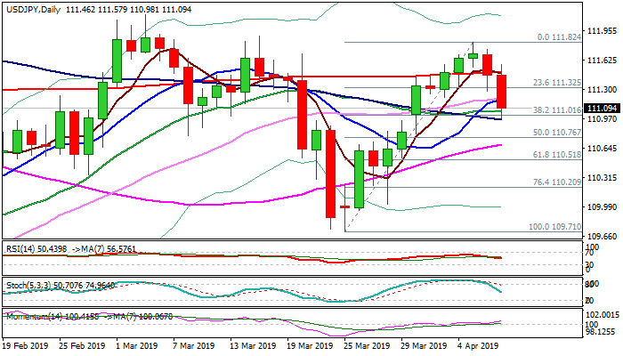 Violation of strong supports at 111 zone 20SMA / Fibo 38.2% of 109.71/111.82 / 100SMA / converged Tenkan / Kijun-sen) would signal further weakness on clear break, however, a massive daily cloud (top of the cloud lays at 110.78) offers very strong support.