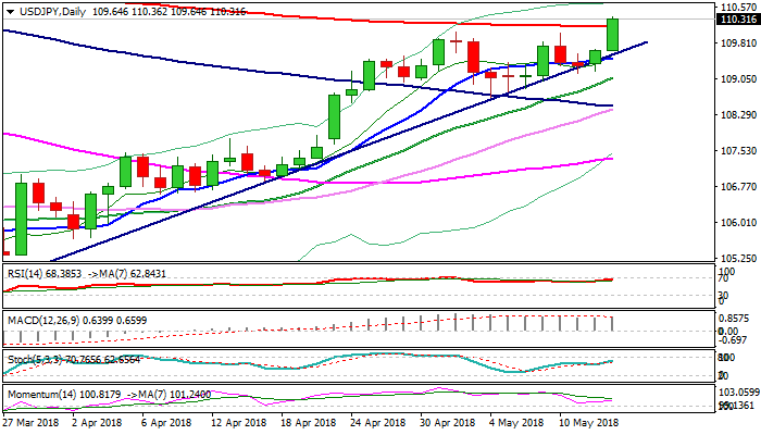 The USDJPY pair eventually broke above strong barriers at 110.00 (psychological / double upside rejection) and 110.15 (200SMA) and cracked Fibo barrier at 110.26 (61.8% of 113.74/104.63 descend) on fresh acceleration of US dollar on rising US yields which broke above 2014 high and solid US retail sales data.