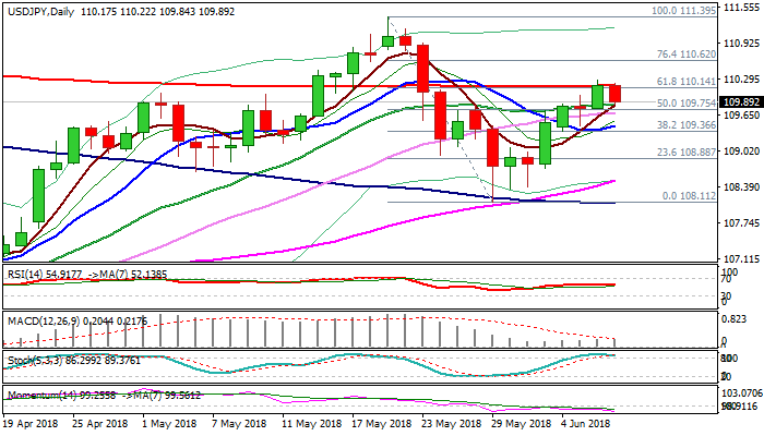 Bulls are facing strong headwinds from 200SMA (at 110.17, reinforced by Fibo 61.8% of 111.39/108.11 bear-leg) which was cracked on Wednesday and caps today’s action.
