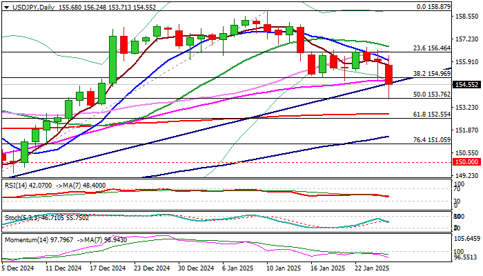 Bears found footstep at 50% retracement of 148.64/158.87 upleg, but upside is likely to be limited, as broken supports at 154.96/76 (Fibo 38.2% / 55DMA) and 154.80 (bull-trendline) reverted to strong resistances.