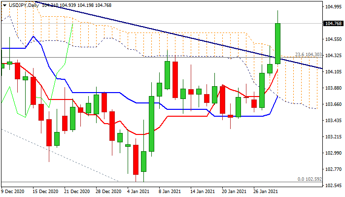 Fresh bulls broke through pivotal 104.30/50 zone (daily cloud top /100DMA / Fibo 61.8% of 105.67/102.59 bear-leg) and accelerated after triggering stops parked above.