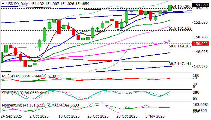 Bulls neared 155.00 (round-figure barrier), violation of which would provide fresh boost on triggering stops, parked just above and expose next targets at 155.88 and 156.24.