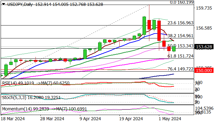 USDJPY edges higher on Monday after a pullback from new record high (160.19) was contained by strong Fibo support at 151.72 (61.8% retracement of 146.48/160.19 upleg, reinforced by 55DMA).