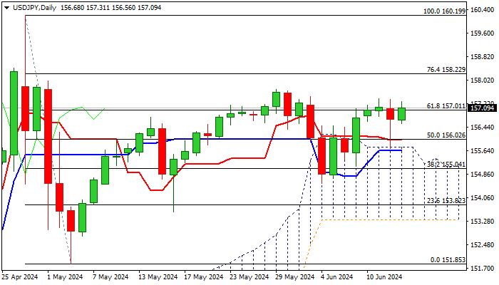 Bullish near-term bias expected above 10DMA (156.45) while violation of daily Tenkan-sen (156.00) would risk test of lower pivot at 155.76 (daily cloud top).