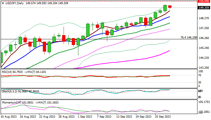 USDJPY edged lower from new multi-month high in early Thursday’s trading, as bulls approached psychological 150 barrier and started to face headwinds.