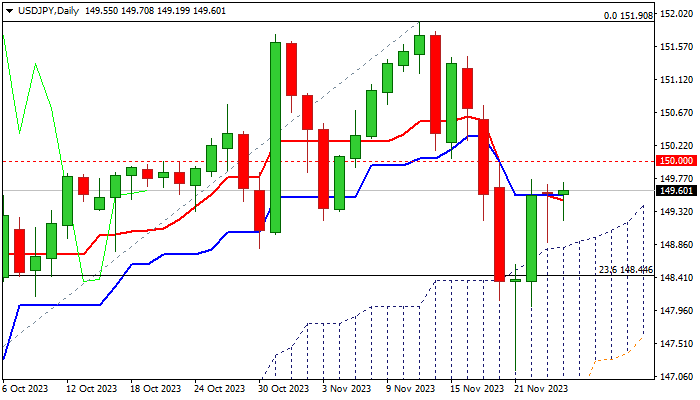 Recent recovery from 147.15 (Nov 21 low of correction from 151.90 peak) seems to be losing traction, despite formation of reversal pattern on daily chart and the action still being underpinned by thick ascending daily Ichimoku cloud.