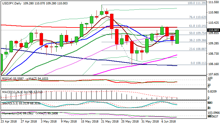Break and close above key 110.14/16 barriers (Fibo 61.8% of 111.39/108.11 bear-leg / 200SMA), after two unsuccessful attempts last week, is needed to confirm continuation of bull-leg from 108.11 (29 May trough).