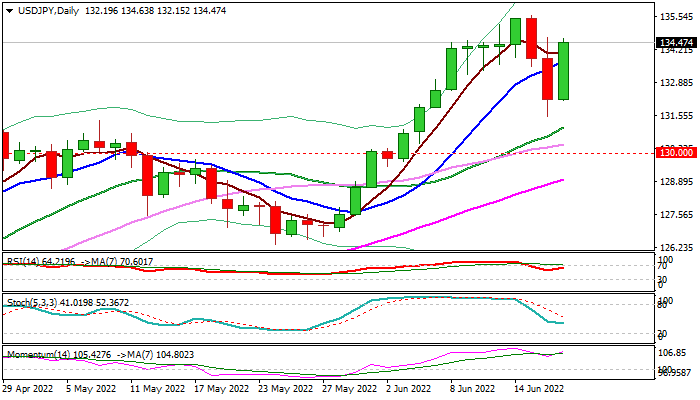 Daily tech returned to full bullish setup and underpin the action for attack Wednesday’s peak at 135.57, violation of which would open way for further advance towards Fibo projections at 136.13 and 138.00.