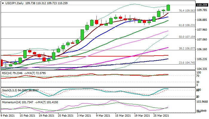 Broken Fibo 76.4% barrier (109.56) reverted to solid support, followed by former high at 109.36 (Mar 15) with extended downticks to find footstep at rising 10DMA (109.17) and keep bulls intact.