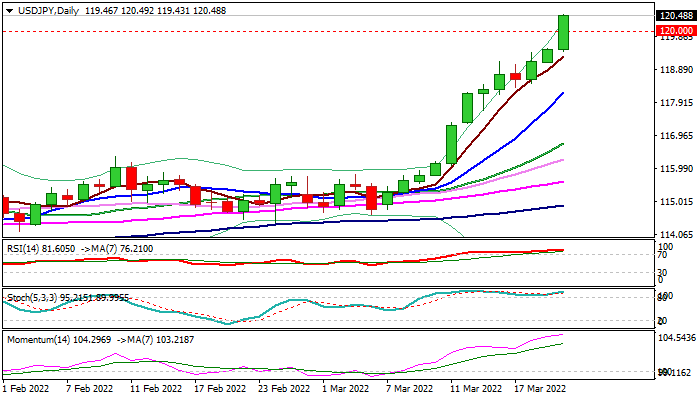 Fresh bullish acceleration broke through pivotal barriers at 119.50 (Fibo 76.4% of 125.84/98.99) and psychological 120 level, generating strong bullish signal.