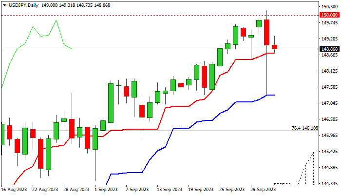 Daily studies remain bullish and supportive for another attack at 150 barrier, break of which would unmask 2022 peak (151.94).