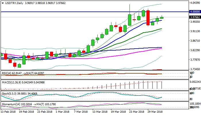 The USDTRY holds in a steady recovery from 3.9338 (29 Mar low, posted after sharp fall) which extends into third straight day and retraced so far 61.8% of 4.0150/3.9338 dip.
