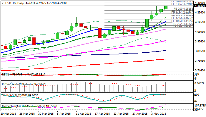 The USDTRY continues to trend higher and posted new all-time high at 4.2997, just ticks below psychological 4.30 barrier, which is currently under strong pressure.