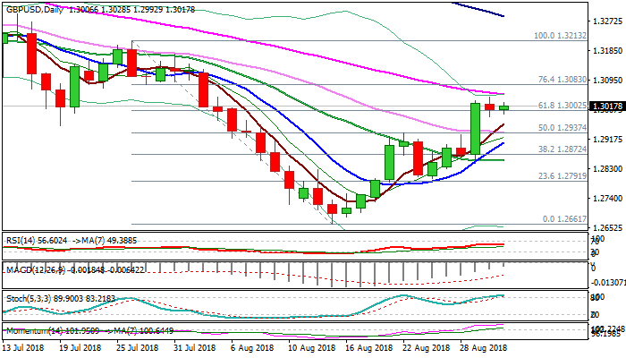 Bullish signals need confirmation on weekly close above 1.30 (Fibo 61.8% of 1.3213/1.2661) to open way for break above 55SMA and extension of recovery rally from 1.2661 (15 Aug low) towards strong barrier at 1.3136 (daily cloud base).