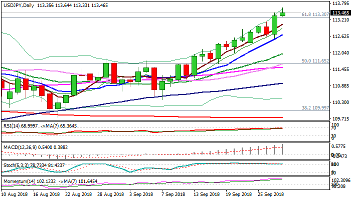 Hawkish Fed and upbeat US data boosted the greenback, which generated strong bullish signal on Thursday’s close above pivotal barriers at 113.17/30 (19 July high / Fibo 61.8% of 118.66/104.63 descend / weekly 200SMA).