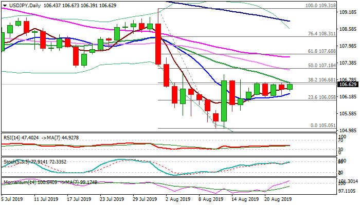 The pair may rally on more dovish tone from Powell, with eventually close above key Fibo barrier / 20DMA (106.68/66) needed for initial bullish signal, which will be verified on extension above falling 30DMA (107.13).