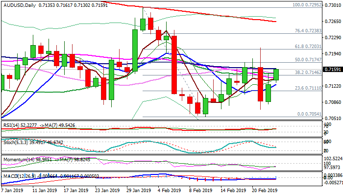 Bullish daily techs continue to support for attack at targets at $58.14/32 (16 Nov lower high / 100WMA), however, reversal of daily stochastic from overbought territory may delay bulls.